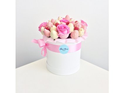 Ovocná kytice je zkombinována z jahod v bílé a růžové belgické čokoládě Callebaut.